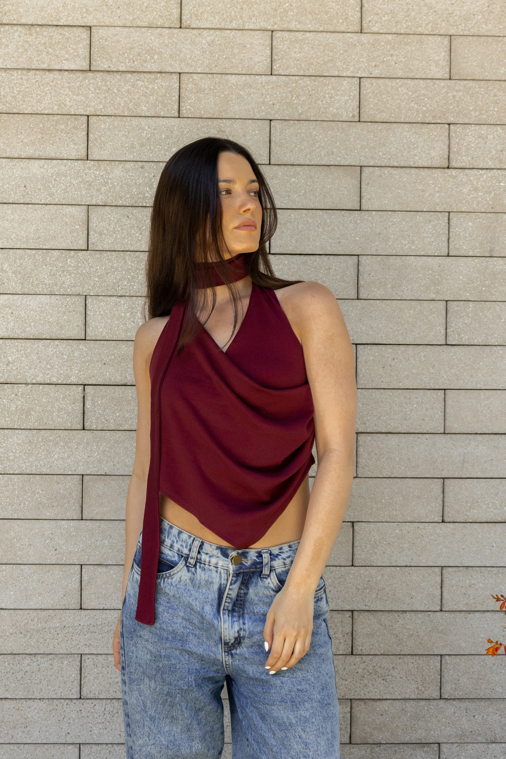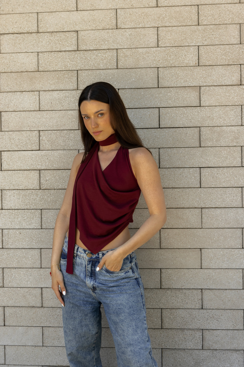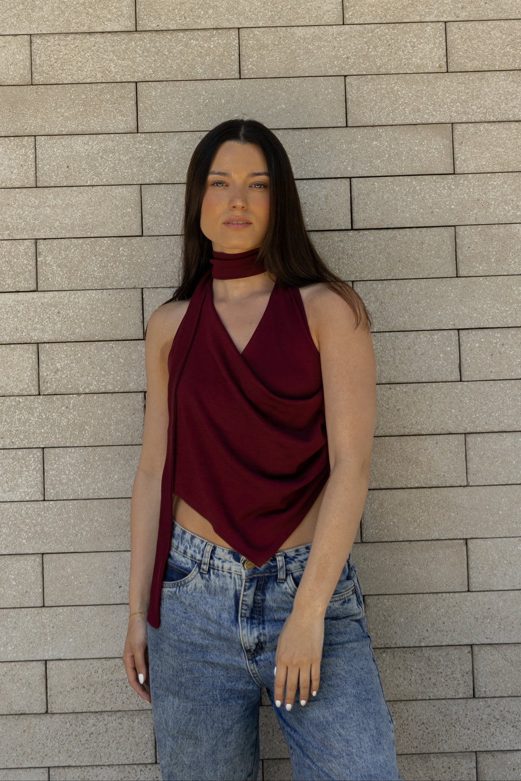 Top asimétrico con drapeado y escote en V. La bufanda/choker puedes usarla o sacarla según tu preferencia. Confeccionado en algodón pima.