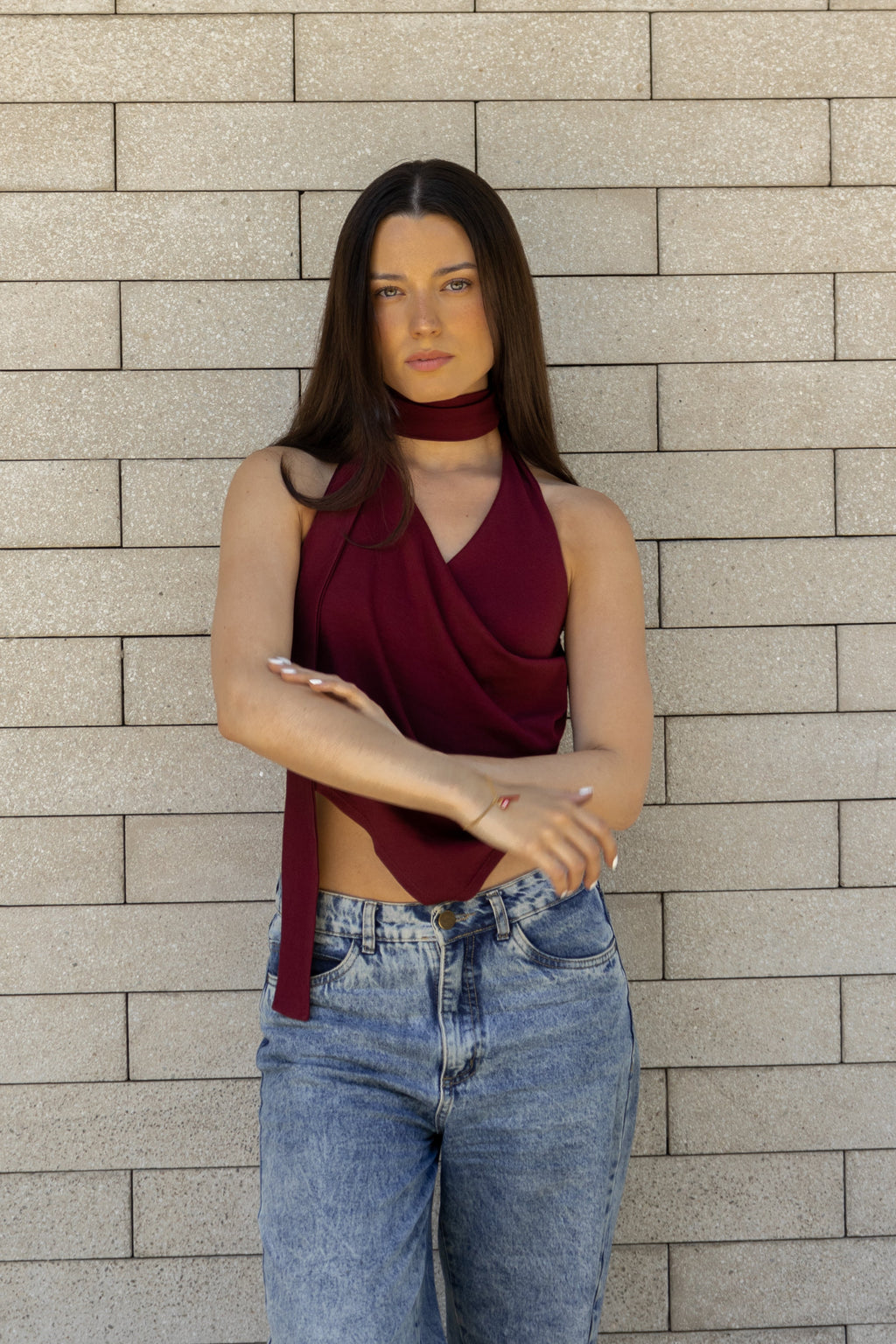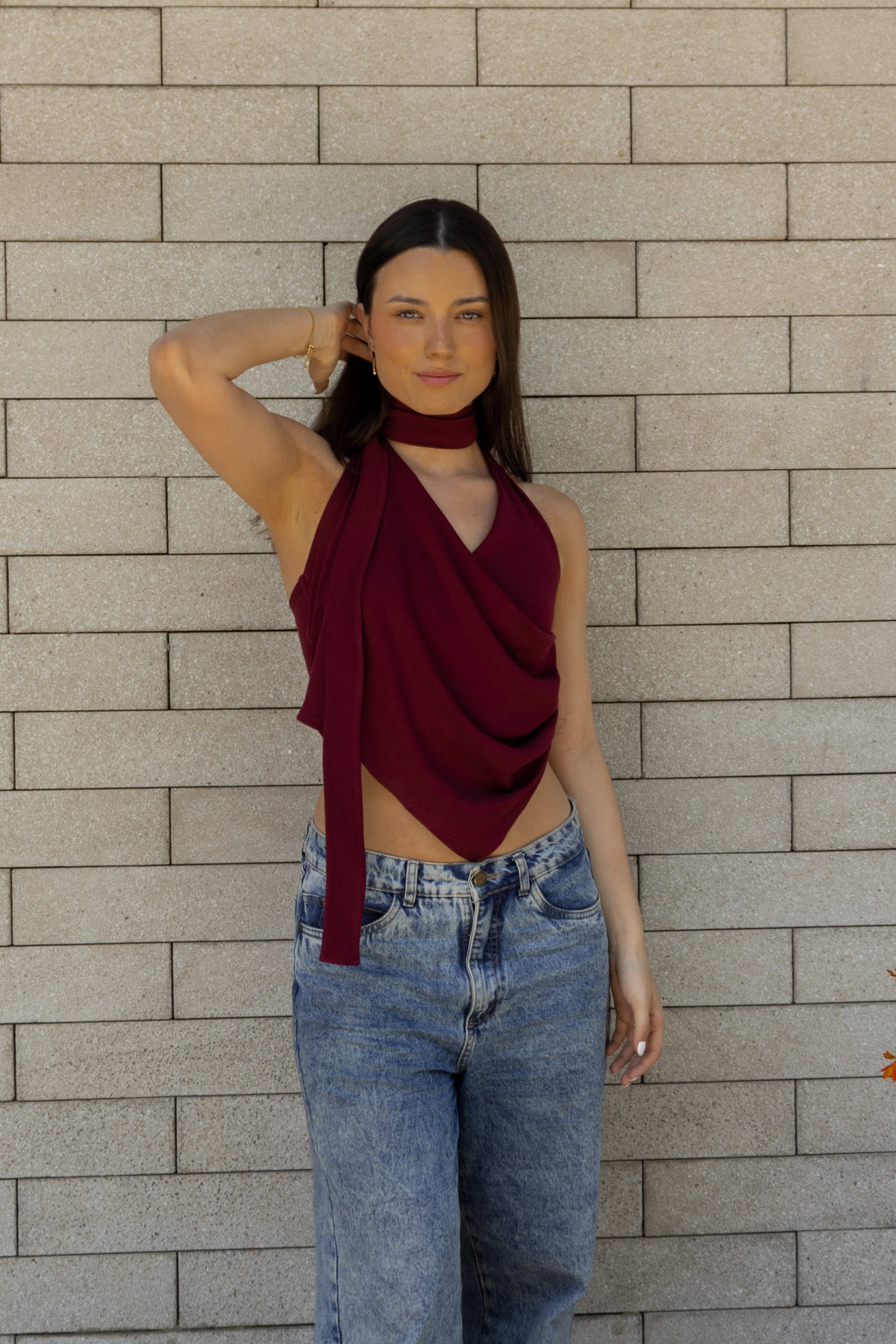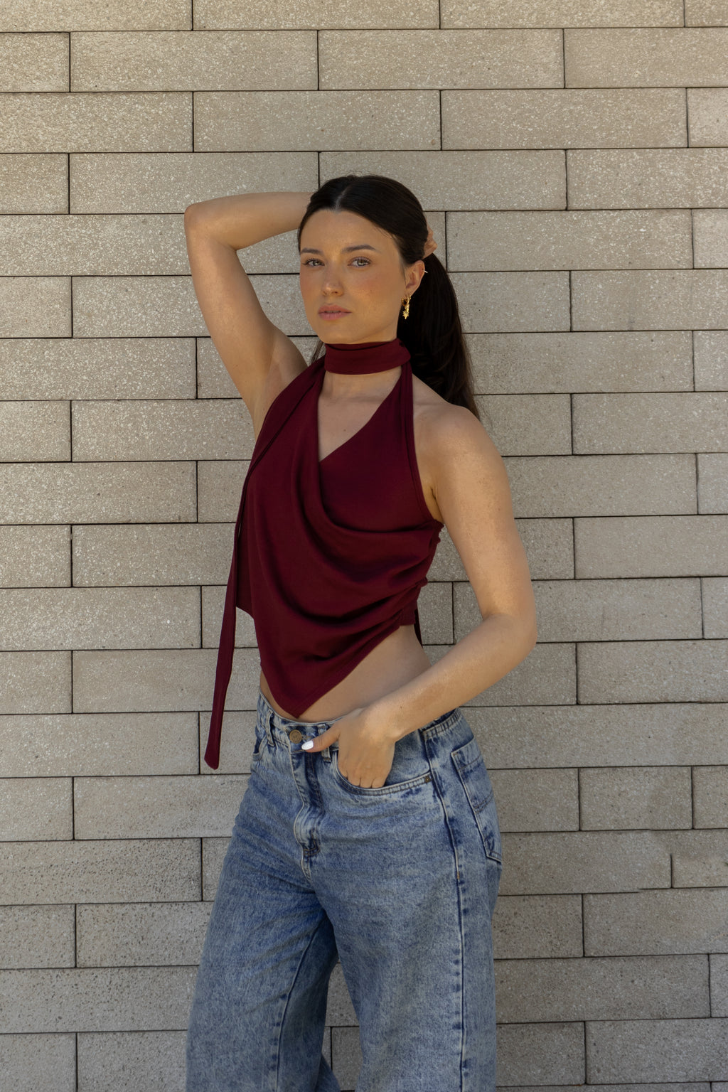 Top asimétrico con drapeado y escote en V. La bufanda/choker puedes usarla o sacarla según tu preferencia. Confeccionado en algodón pima.