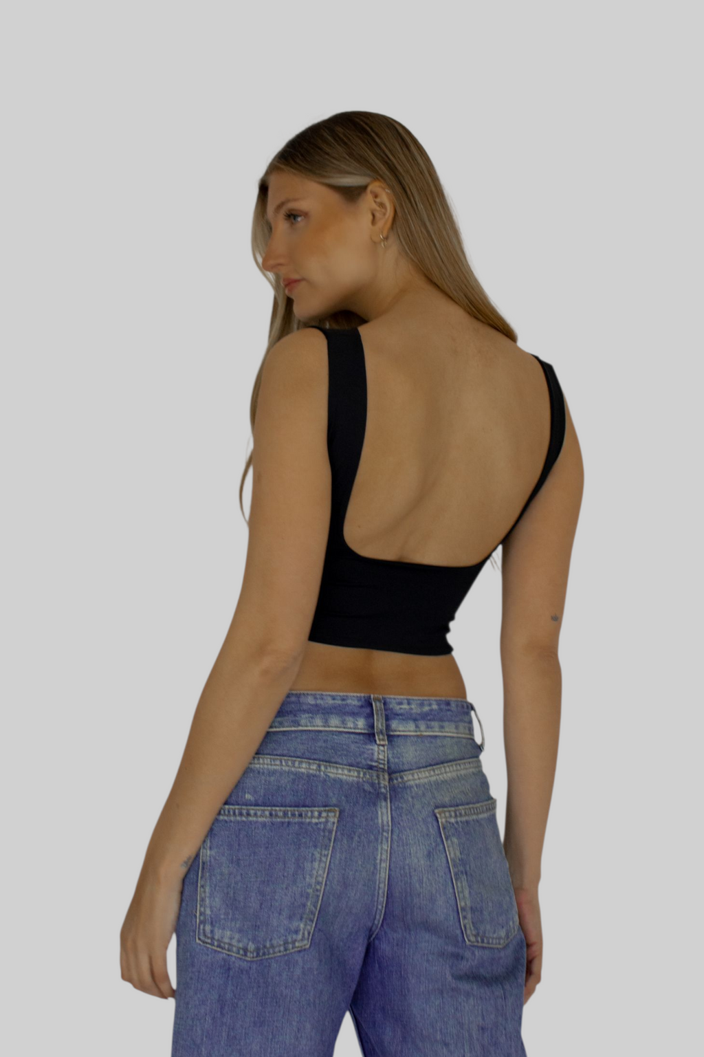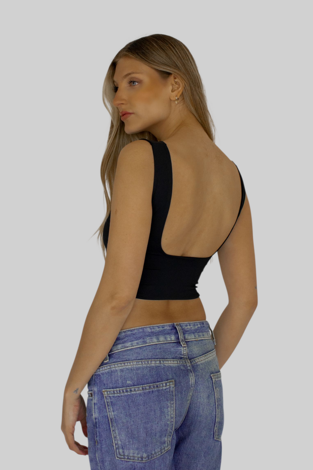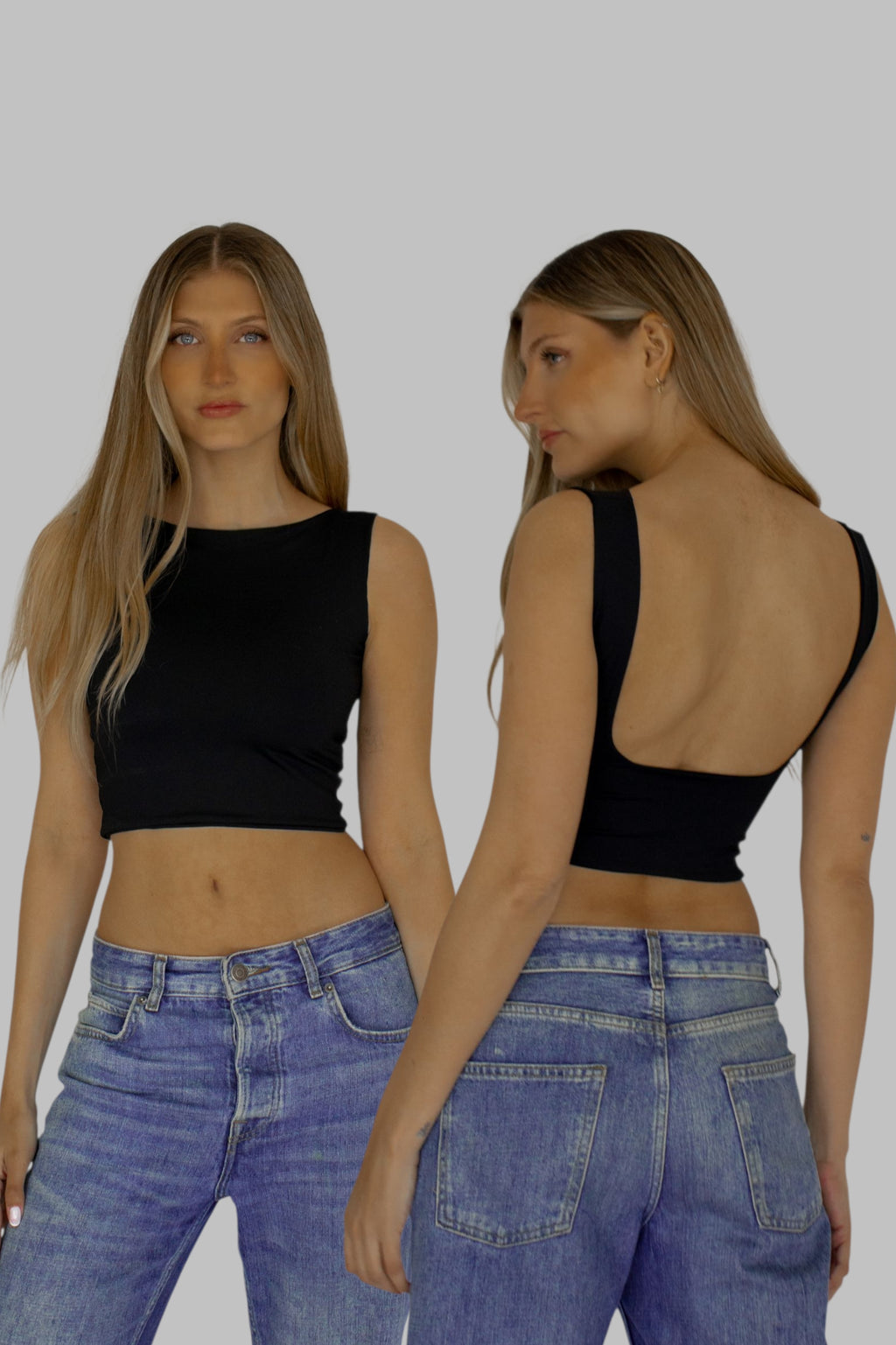 Top elasticado forrado completamente en doble tela sin costuras a la vista. Diseño con espalda rebajada con corte cuadrado y delantero con cuello cerrado. Confeccionado en lycra, tela muy confortable y de alta calidad, no forma piling.