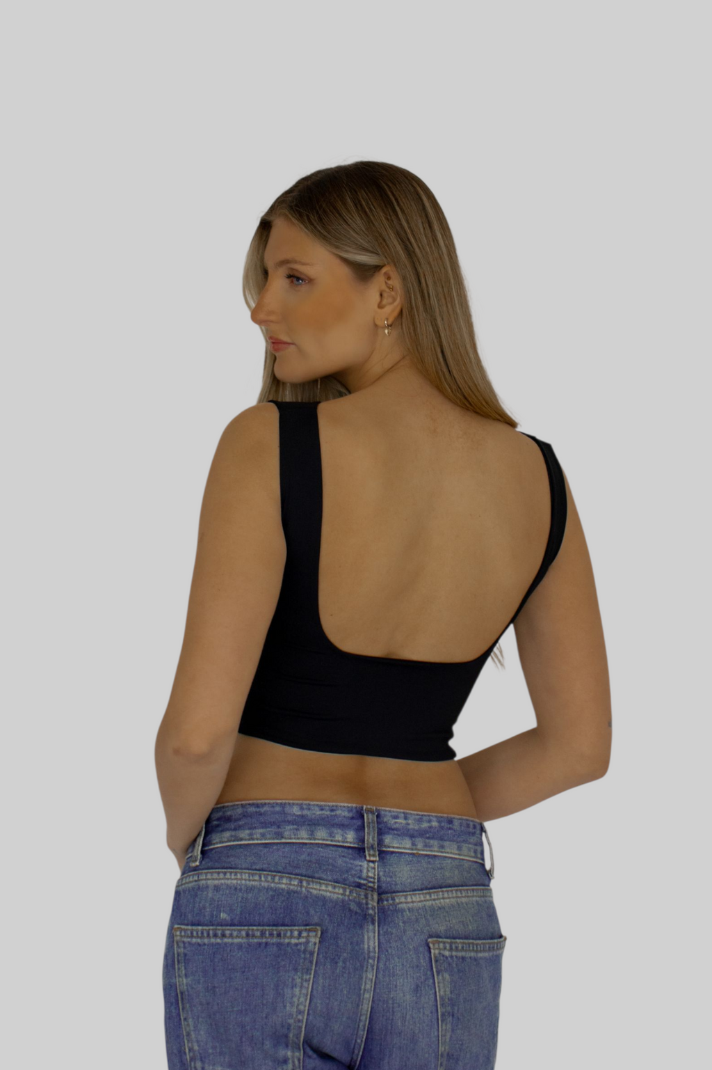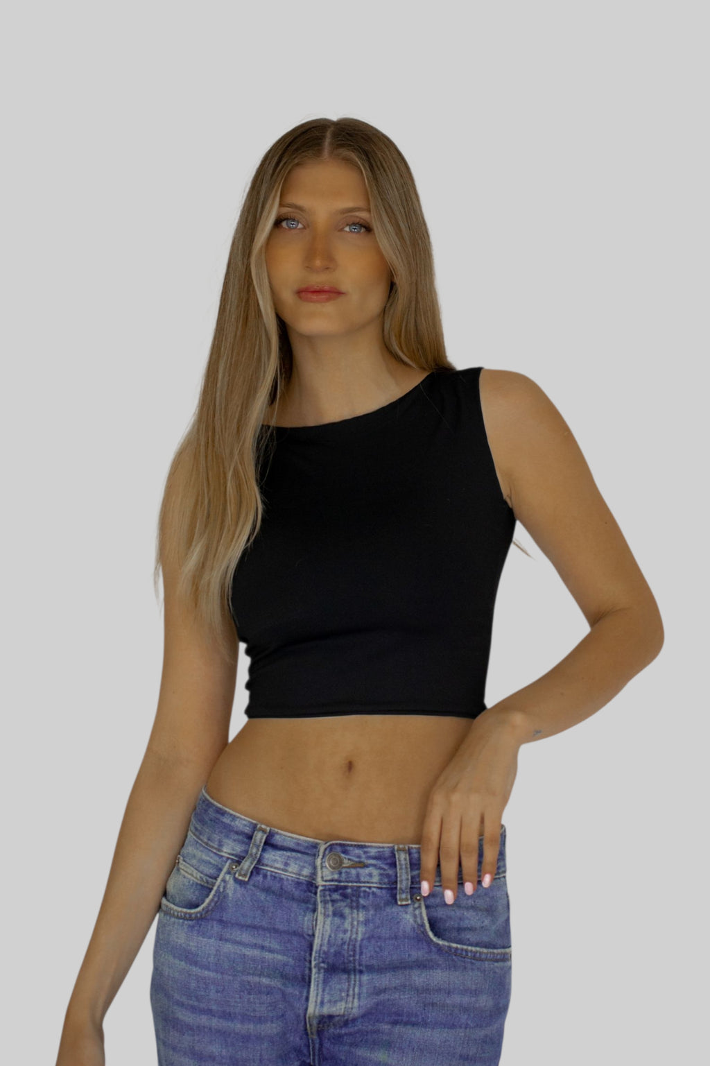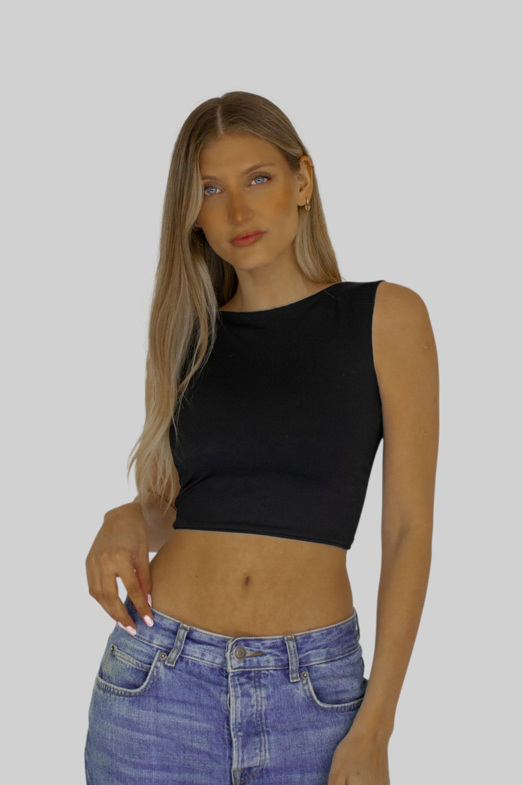 Top elasticado forrado completamente en doble tela sin costuras a la vista. Diseño con espalda rebajada con corte cuadrado y delantero con cuello cerrado. Confeccionado en lycra, tela muy confortable y de alta calidad, no forma piling.