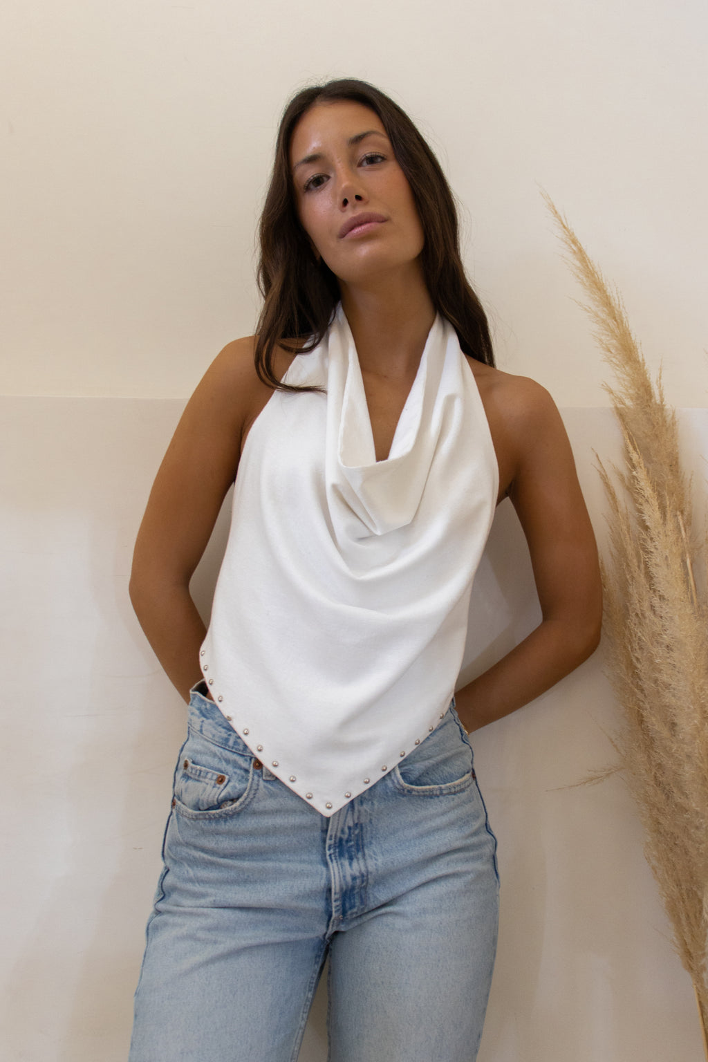 Top de lino con cuello drapeado, espalda descubierta y aplicación de tachas metálicas. Completamente forrado en doble tela, sin costuras a la vista.